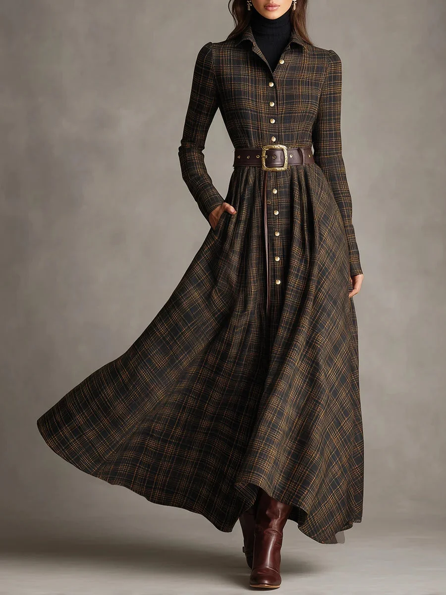Brown and Black Plaid Lapel Single-Breasted Shirt Long Dress