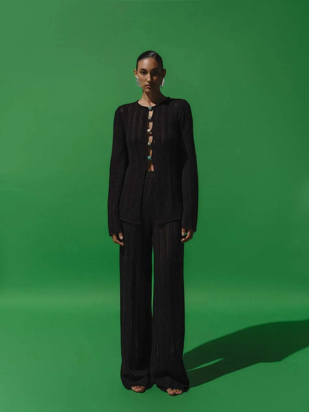 Introducing the "Corsica Pants" in Black – a high-waisted, straight-leg silhouette crafted in sheer knit fabric. Designed with an elastic waistband for comfort. Unlined for a lightweight feel. Paired perfectly with the matching Corsica Top.