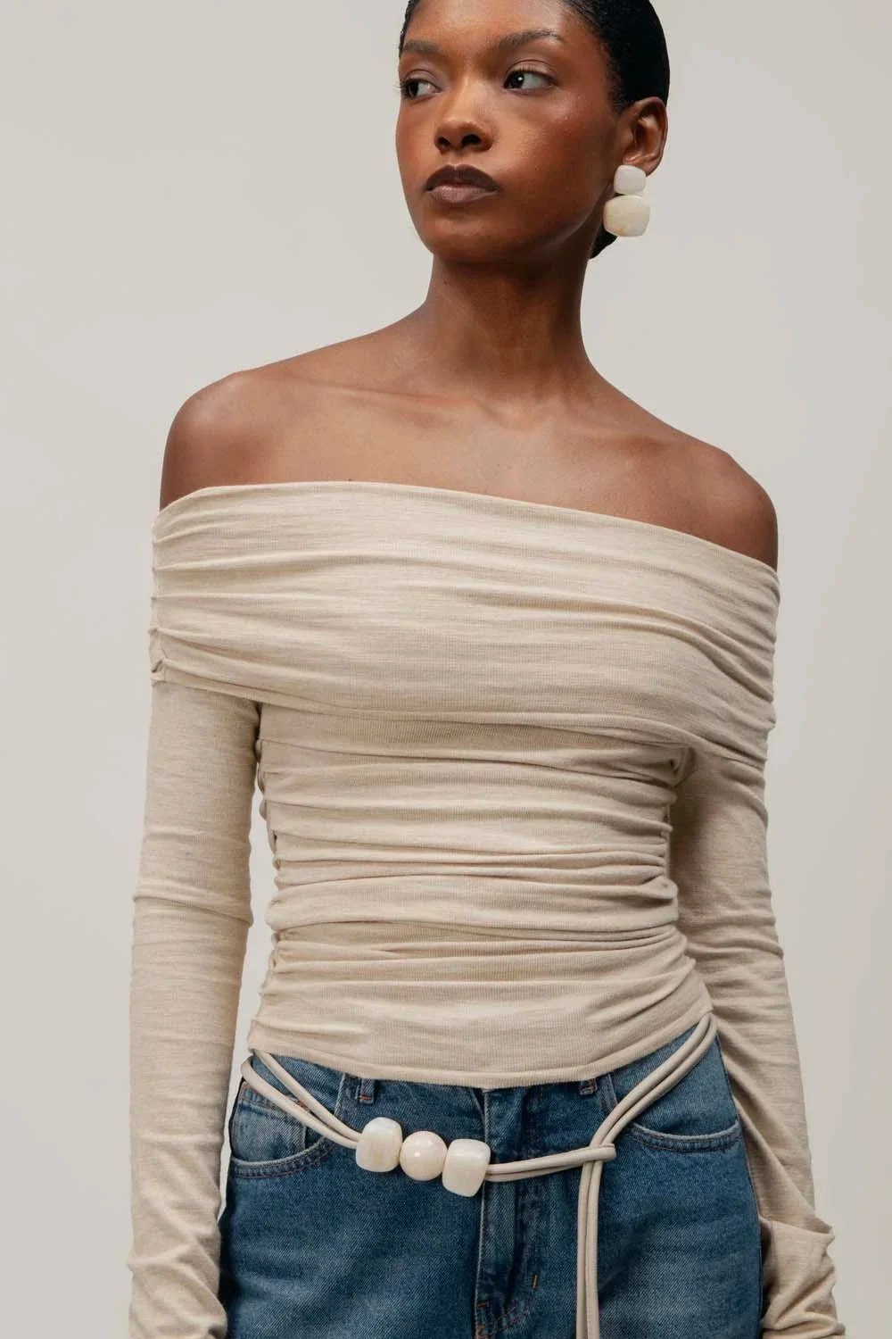 Introducing the "Fuji Top" in Honey – this off the shoulder top exudes effortless elegance with its draped and ruched silhouette. Crafted from a knit fabric, it combines comfort with a touch of sophistication. Perfect for any occasion where you want to showcase both style and ease.