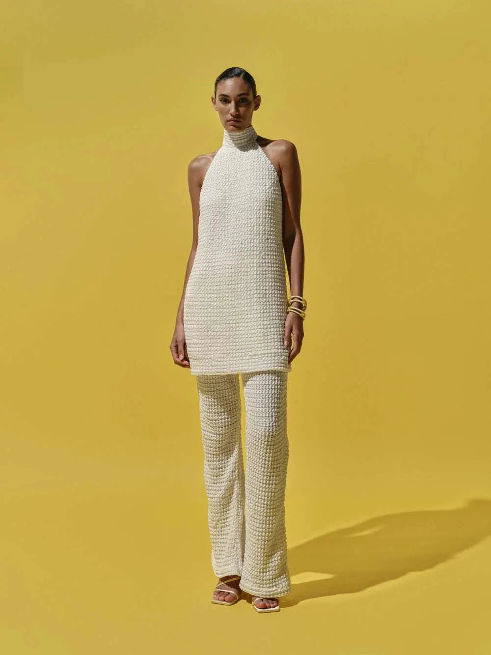 Introducing the "Robin Pants" in Ecru – straight-leg pants crafted in bubble fabric, featuring back darts and a reinforced waistband for structure. Designed with a side zipper closure and left unlined for a lightweight feel. Pair with the matching top for a full look.