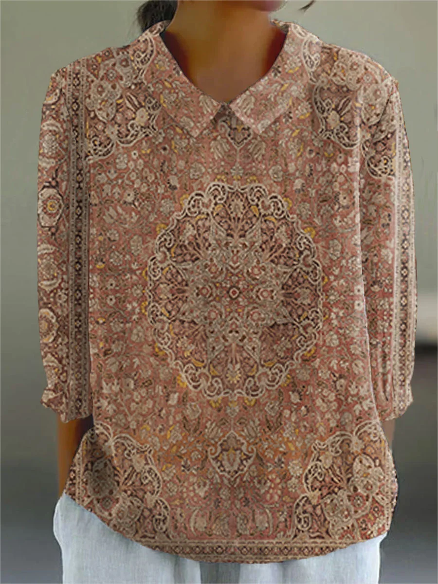 Women's Boho Vintage Art Print Casual Cotton And Linen 3/4 Sleeve Shirt