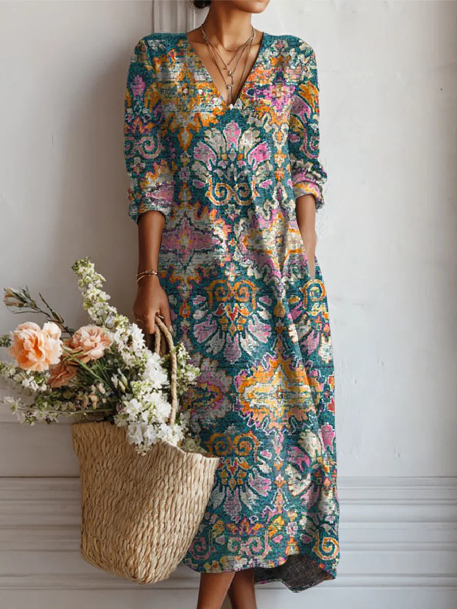 Women's Vintage Flower Art Print Linen Pocket Tunic Dress